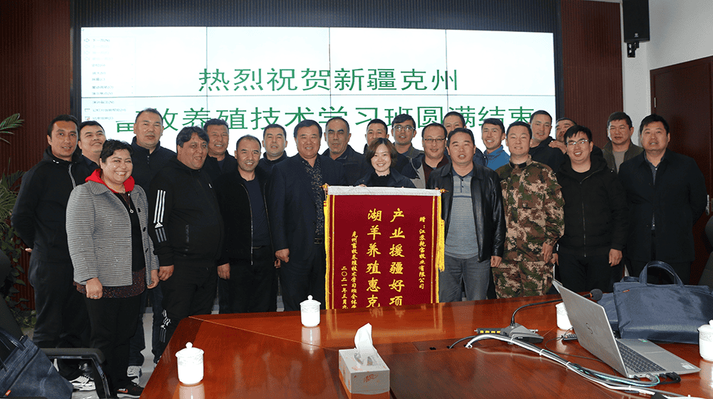 3月19日上午,江蘇乾寶牧業(yè)公司會議室里,洋溢著歡樂友好的氣氛,乾寶牧業(yè)司總裁蔣柏林熱情地與來自新疆克孜勒蘇柯爾克孜自治州19位學(xué)員親切座談,回答了學(xué)員們提出的湖羊養(yǎng)殖政策、管理和技術(shù)方面的問題,學(xué)員們感到受益匪淺。座談結(jié)束后,學(xué)員代表將一面印有“產(chǎn)業(yè)援疆好項(xiàng)目,湖羊養(yǎng)殖惠克州”金字錦旗贈送給乾寶牧業(yè)公司,以表達(dá)他們的感激之情。