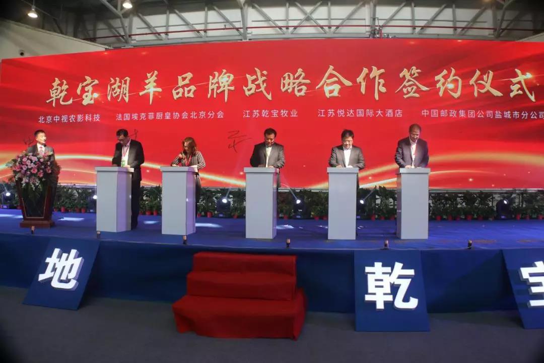 為深入挖掘乾寶湖羊文化、進一步研發(fā)和打造乾寶湖羊羊肉產(chǎn)品、不斷提升乾寶湖羊品牌在國內(nèi)外消費市場中的影響力,由江蘇乾寶牧業(yè)有限公司與北京中視農(nóng)影科技有限公司、法國??朔茝N皇協(xié)會北京分會、悅達國際大酒店、中國郵政集團公司鹽城分公司共同簽署戰(zhàn)略協(xié)議。